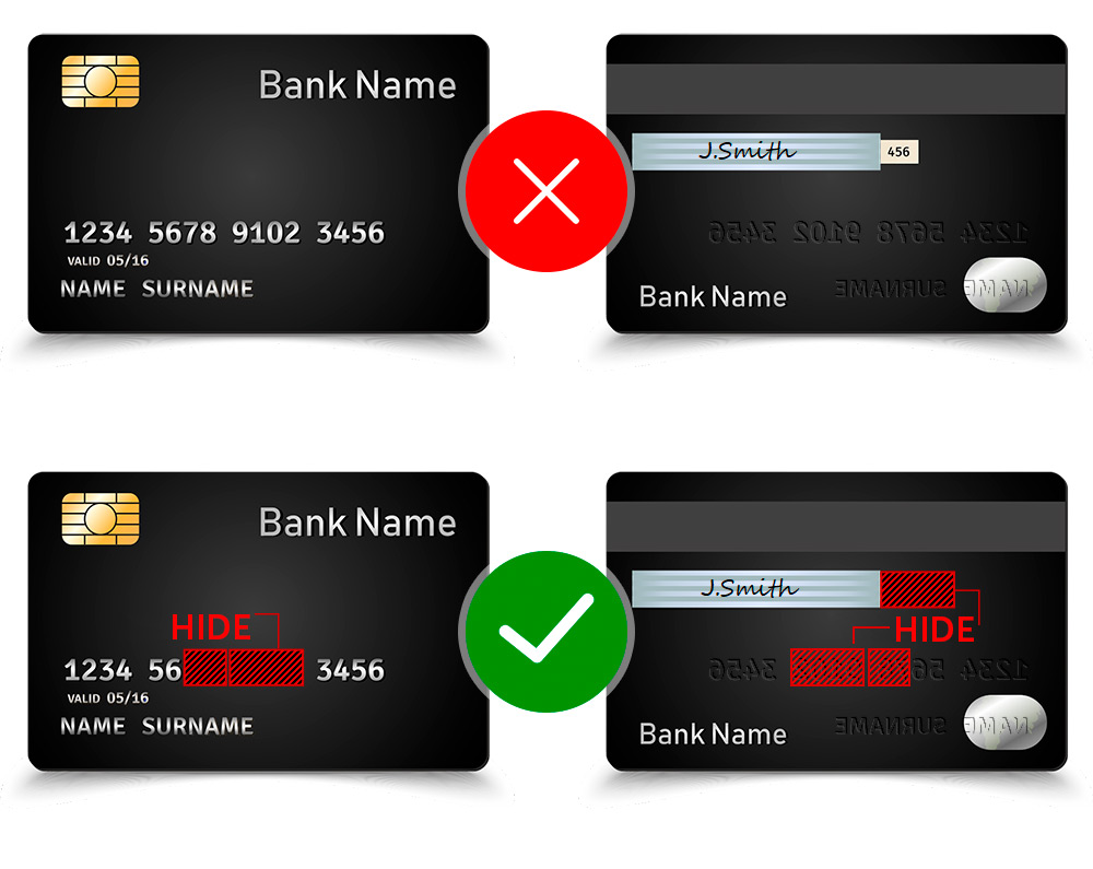 For the sake of your security, we ask you to hide a part of the card number on the front and back of the card, leaving only the first 6 and the last 4 digits. Also, you need to hide the CVC2 / CVV2 code on the backside.